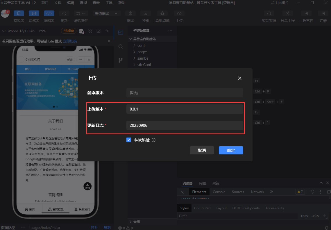 9,填写版本和日志。版本自定义,如0.0.2。日志可以写日期,也可以写一些备注。点击确认即可。