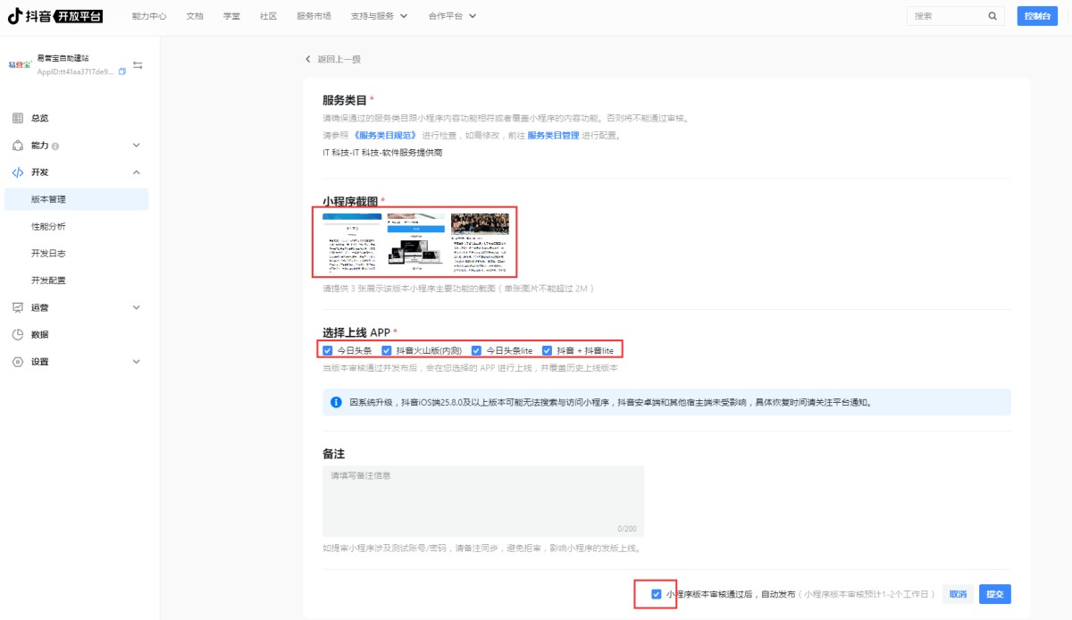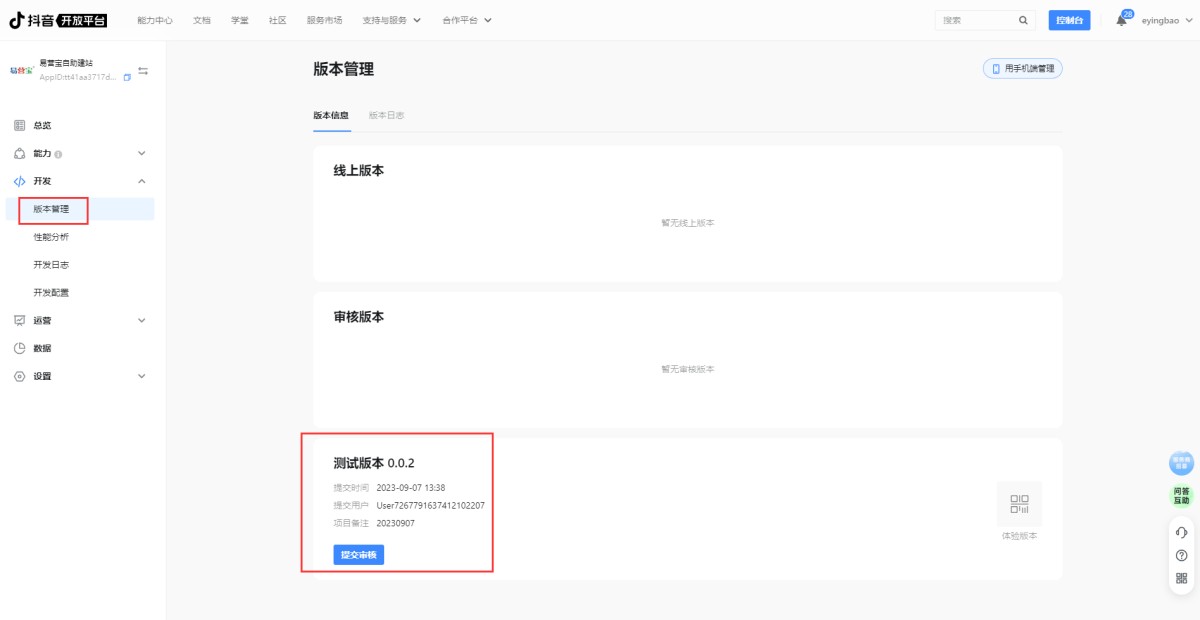 10,提交后,进入抖音开放平台,点击开发-版本管理,可以看到提交上来的版本。点击提交审核。