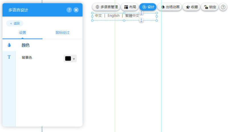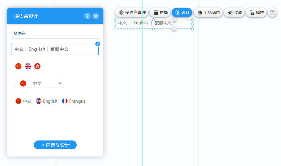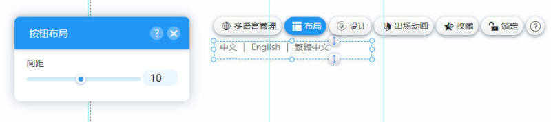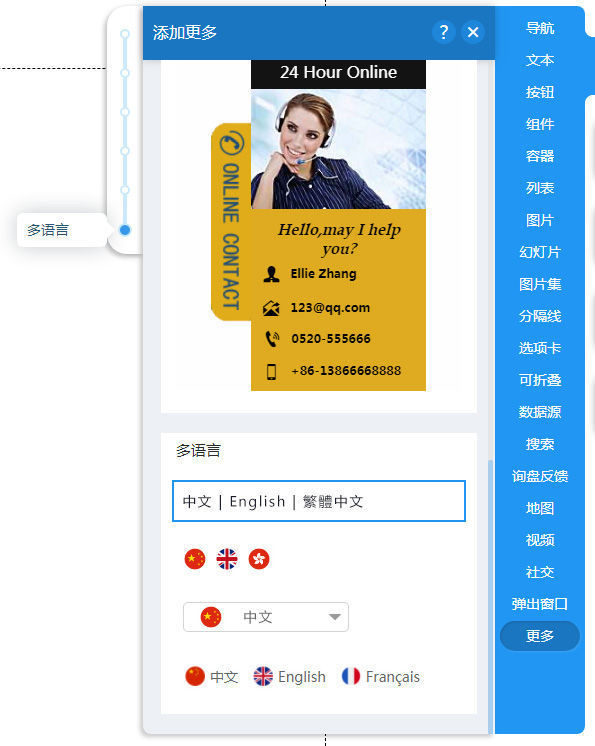 1,在工具库里点击更多找到多语言控件,选择多语言的样式,我们目前提供了4种样式。