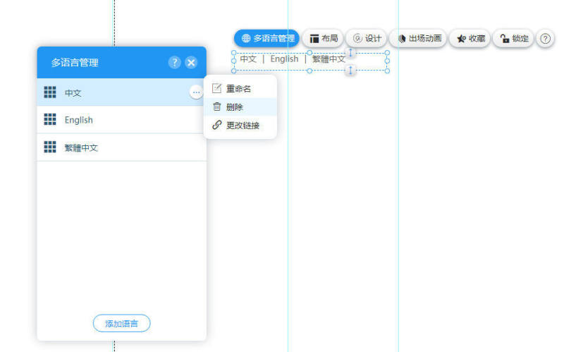 3,点击多语言管理按钮,弹出管理界面,我们可以对每一项进行重命名,删除及更换连接的操作