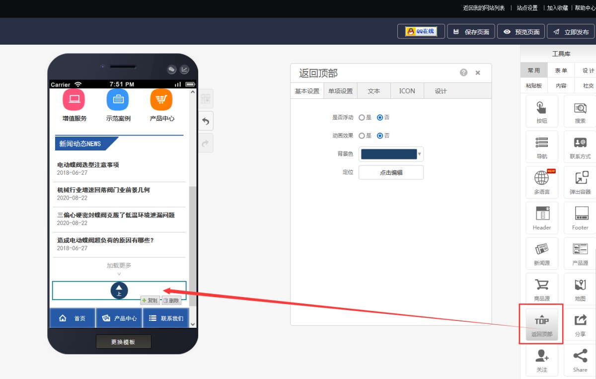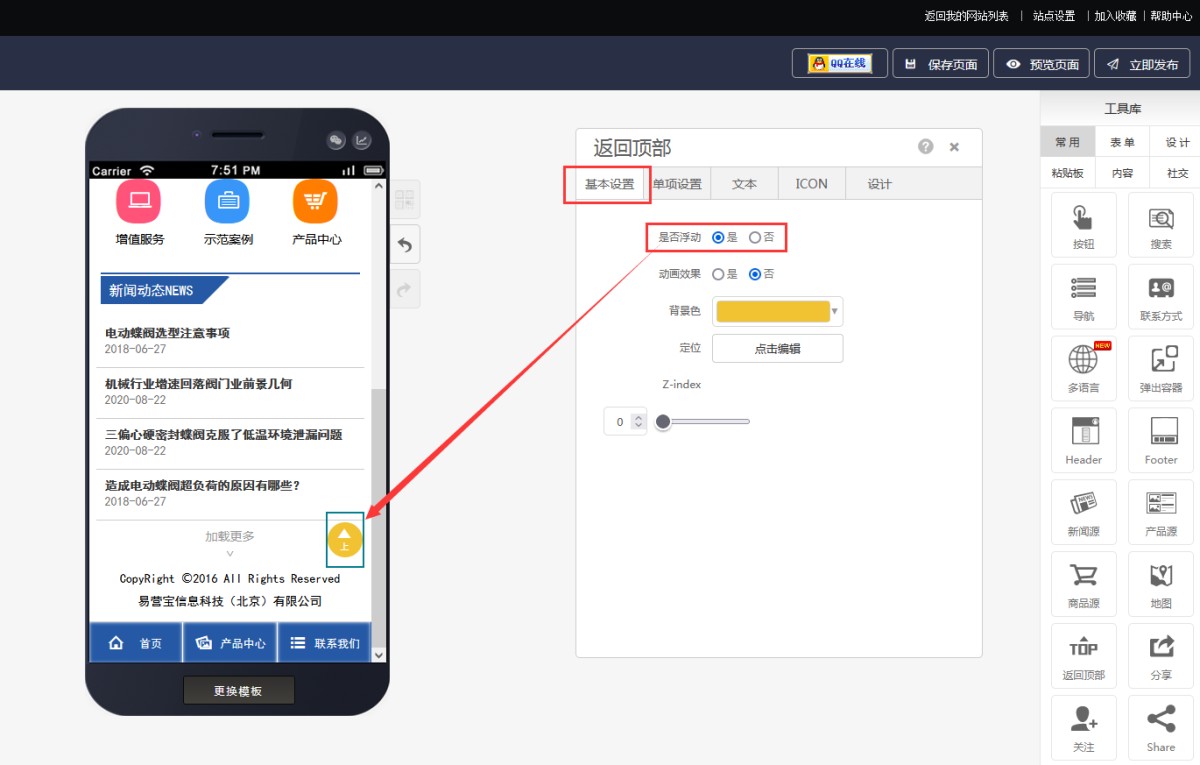 2,在控件属性-基本设置中,选择是否浮动、背景色等属性。开启浮动后,返回顶部控件会浮动显示在屏幕的右下方。