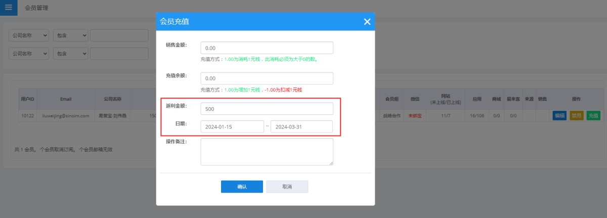 2,在充值界面的返利金额这里输入充值金额,并设置有效期(每次返利金的有效期不一样,如果不确定可以咨询易营宝客服)。点击确定即可。
