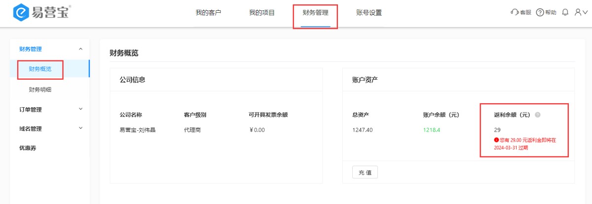 3,充值成功后,可以登录建站账号查看。在财务管理-财务概览里,可以看到返利金的余额和有效期。网站上线和续费时系统会优先使用返利金余额。