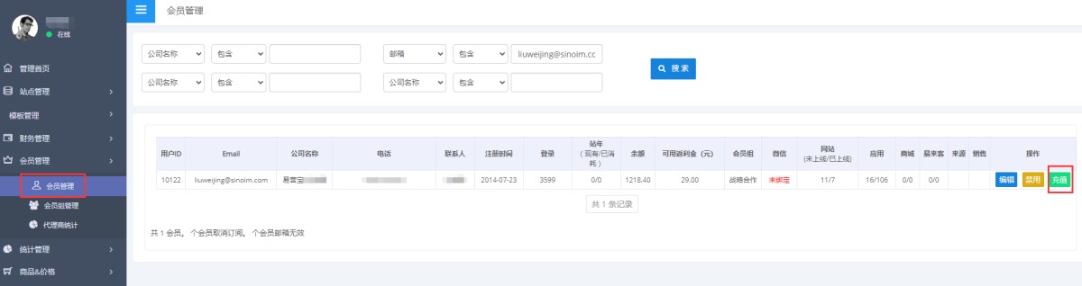 1,在OEM超级管理后台-会员管理里, 搜到要充值的账户,点击充值按钮。