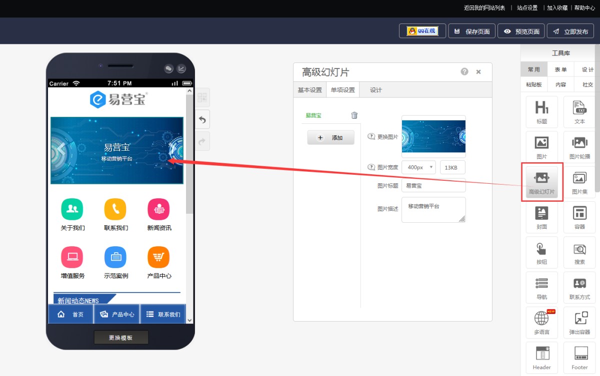 1,从工具库里选择高级幻灯片控件,拖拽添加到页面上。