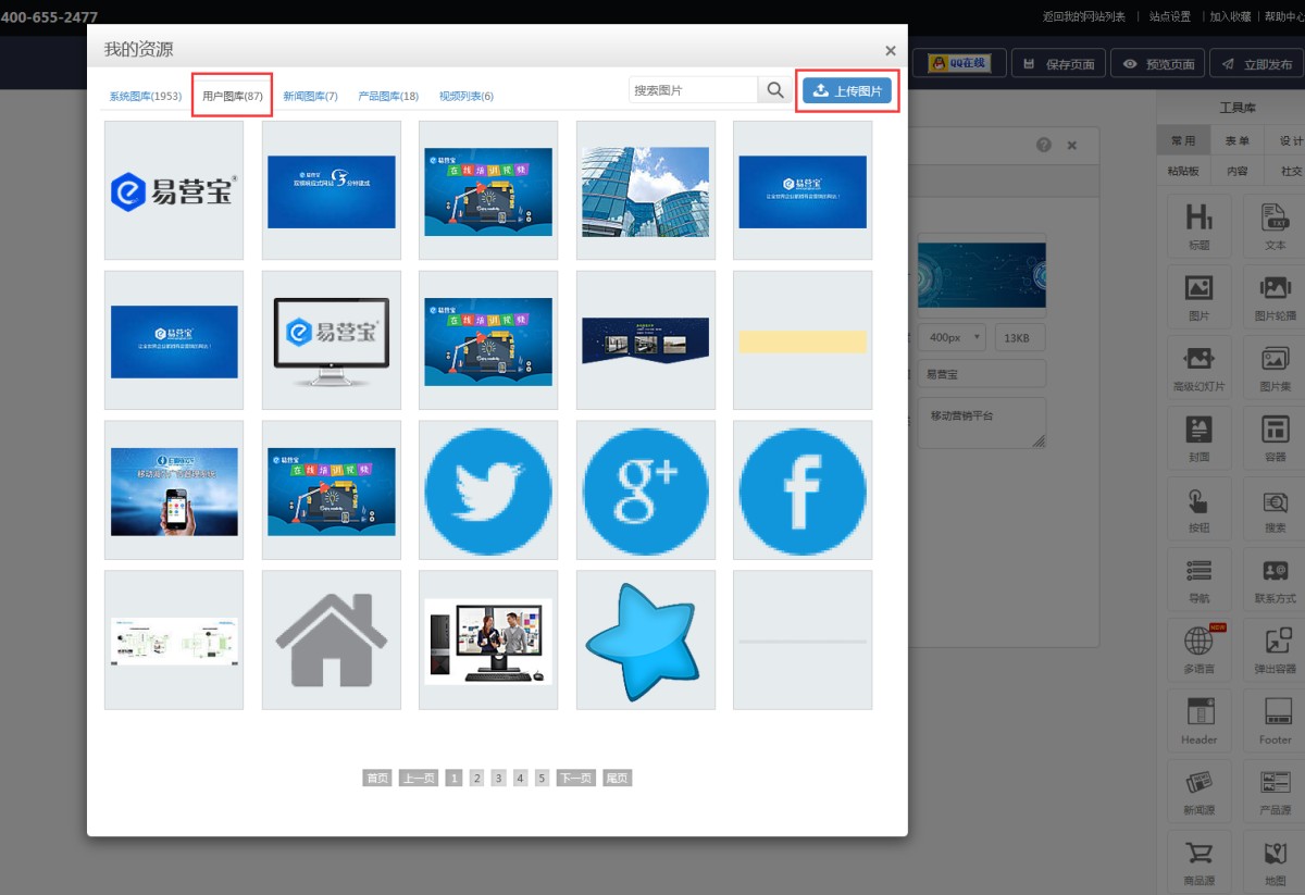 2,拖入高级幻灯片控件会,会自动弹出“我的资源”窗口,可以在用户图库里点击上传图片。(注:添加的图片尺寸要统一)