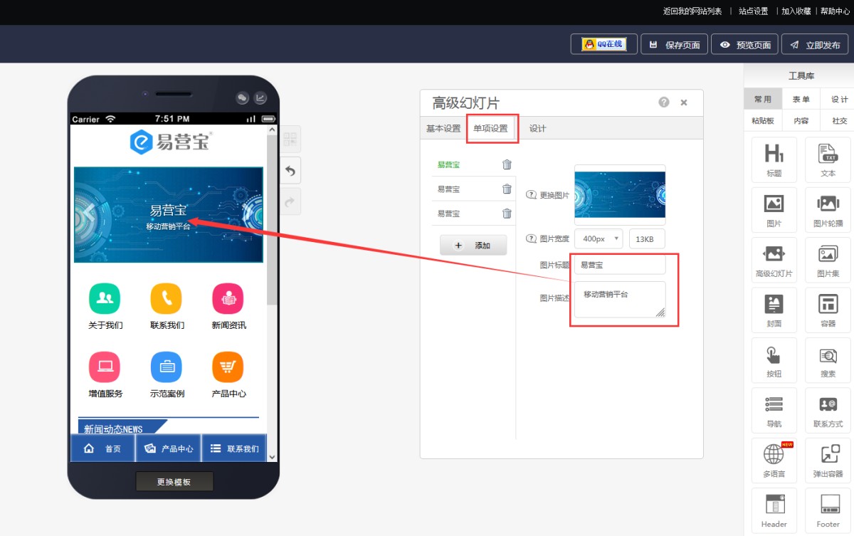 3,在单项设置中,可以增加、修改和删除图片,每个图片可以设置图片宽度(即清晰度),填写图片的标题和描述。