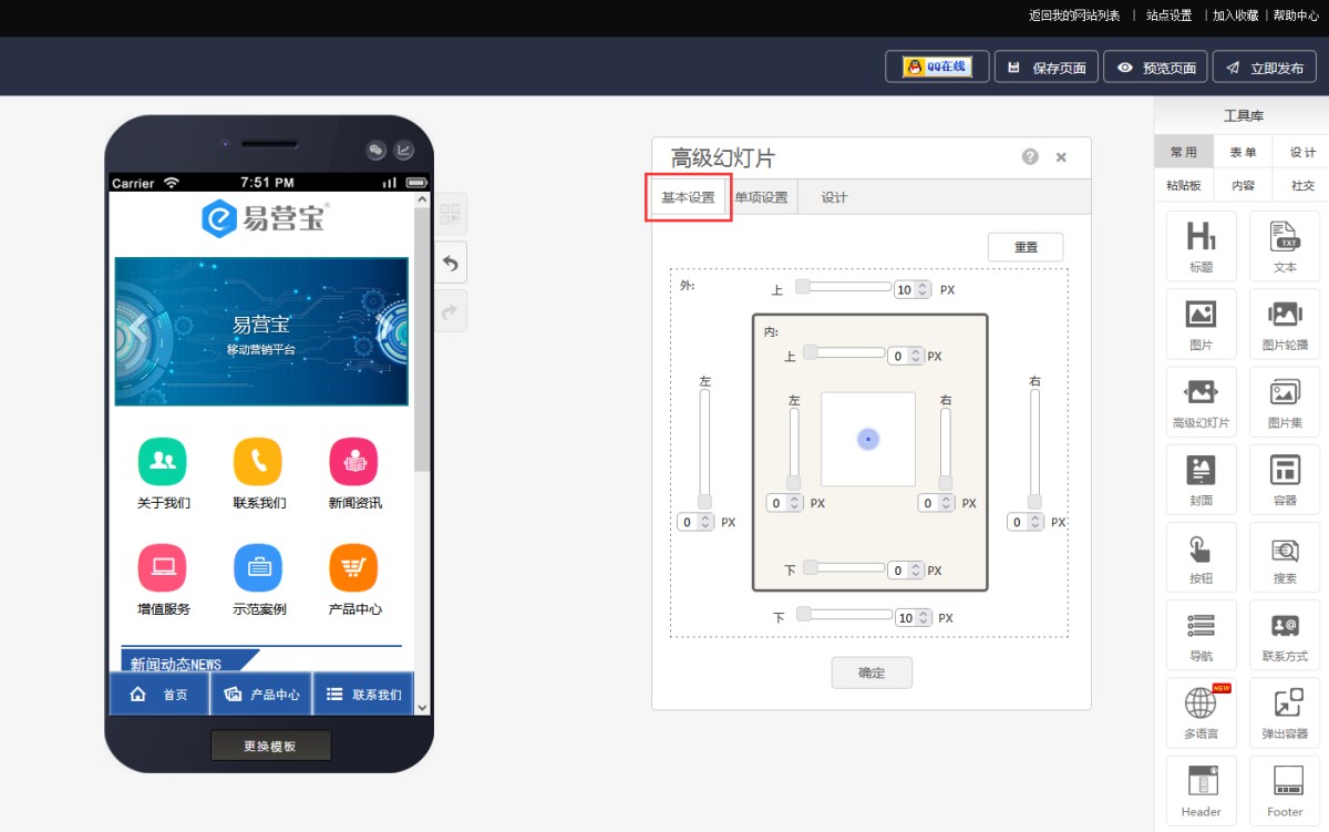 5,在基本设置里,可以调整幻灯片的上下左右间距。