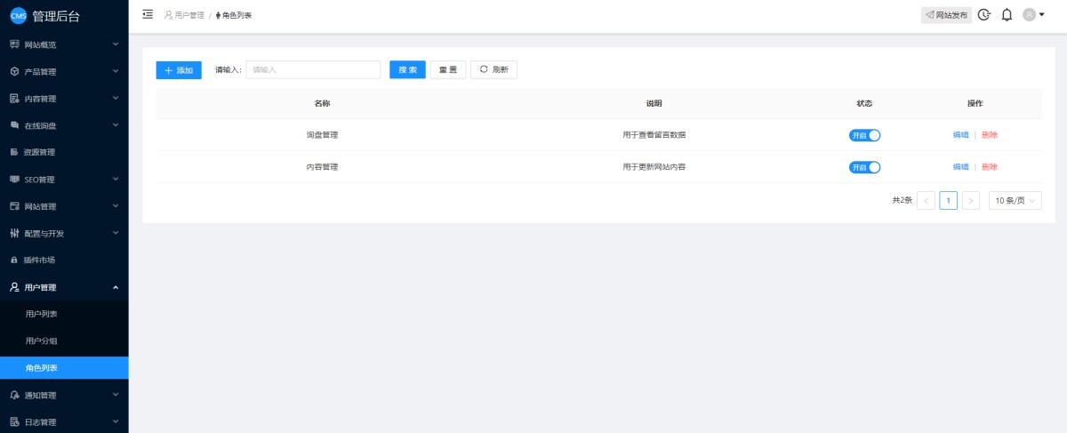 ②,内容管理:即网站内容编辑的权限,包含网站概览,产品管理,内容管理,资源管理,SEO管理等。