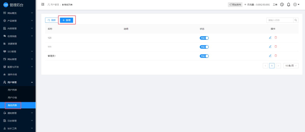 1,在管理后台,用户管理-角色列表里,系统会默认两个角色: