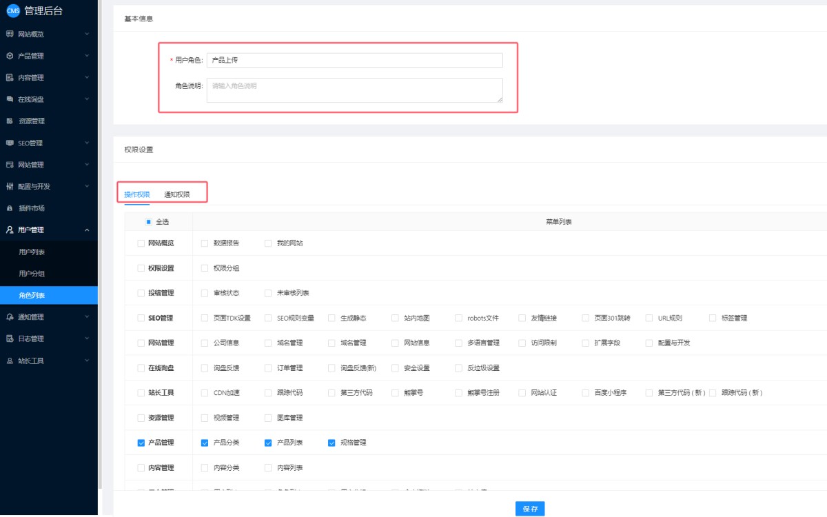 3,在角色设置页面添加角色名称和说明,勾选要开通的权限,包含操作权限和通知权限。点击保存。