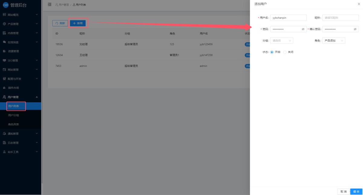 4,在用户列表里点击“新增”,在弹窗里设置用户名和密码,勾选角色,点击提交即可。
