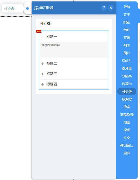 1,在工具库里点击可折叠控件,选择可折叠的样式,我们目前仅提供1种样式。