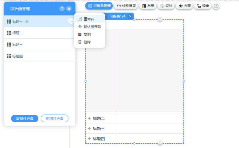 3,点击可折叠选项按钮,该属性是对可折叠各选项卡进行重命名,复制及删除的操作,你可以设置设置某可折叠选项默认展示,当然也可以直接添加可折叠选项。