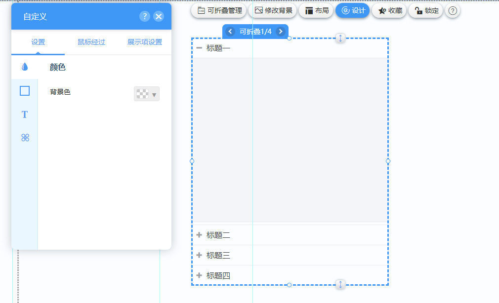 6,设计 属性里,我们可以设置整体可折叠项,鼠标经过项和展示项进行样式的设计,包括背景,边框,文字及ico。