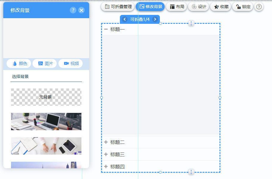 4,修改背景 属性里,你可以对当前可折叠选项进行背景的设置,我们提供颜色,背景图片,视频三种形式的背景。