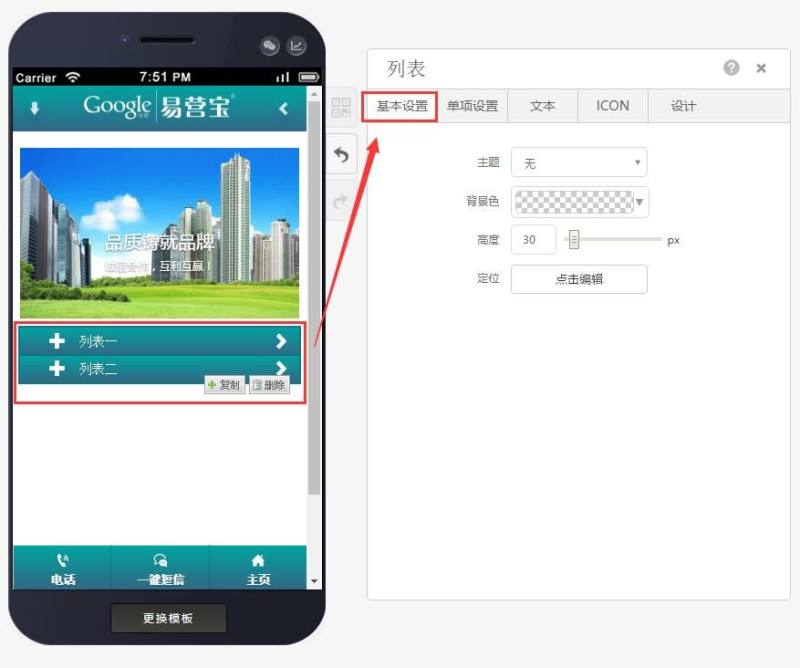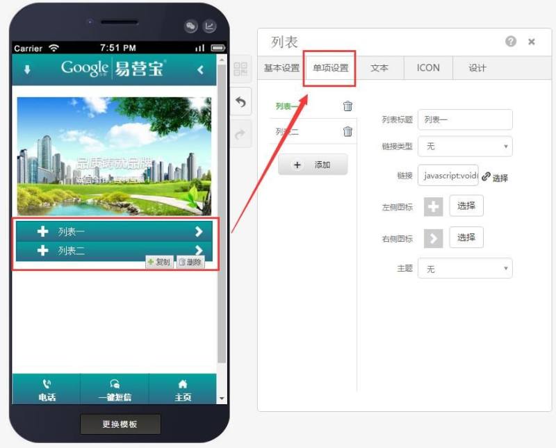 第二步:单项设置中可以进行增减项、更改标题、设置链接类型,填写链接、更换图标以及选择主题色,如下图: