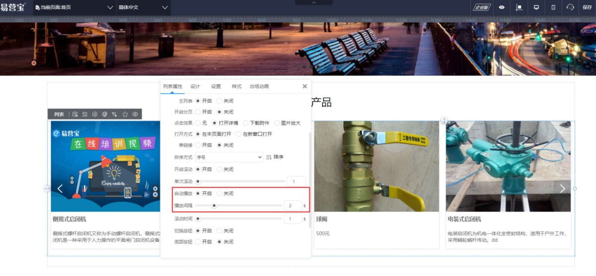 1,检查列表的滚动设置。列表开启滚动后,可以设置是否自动播放。如果选的是自动播放,检查一下播放间隔是否设置的太大,建议是2秒。如果间隔太大,预览时要等好久才会滚动一下,容易误认为列表不滚动。