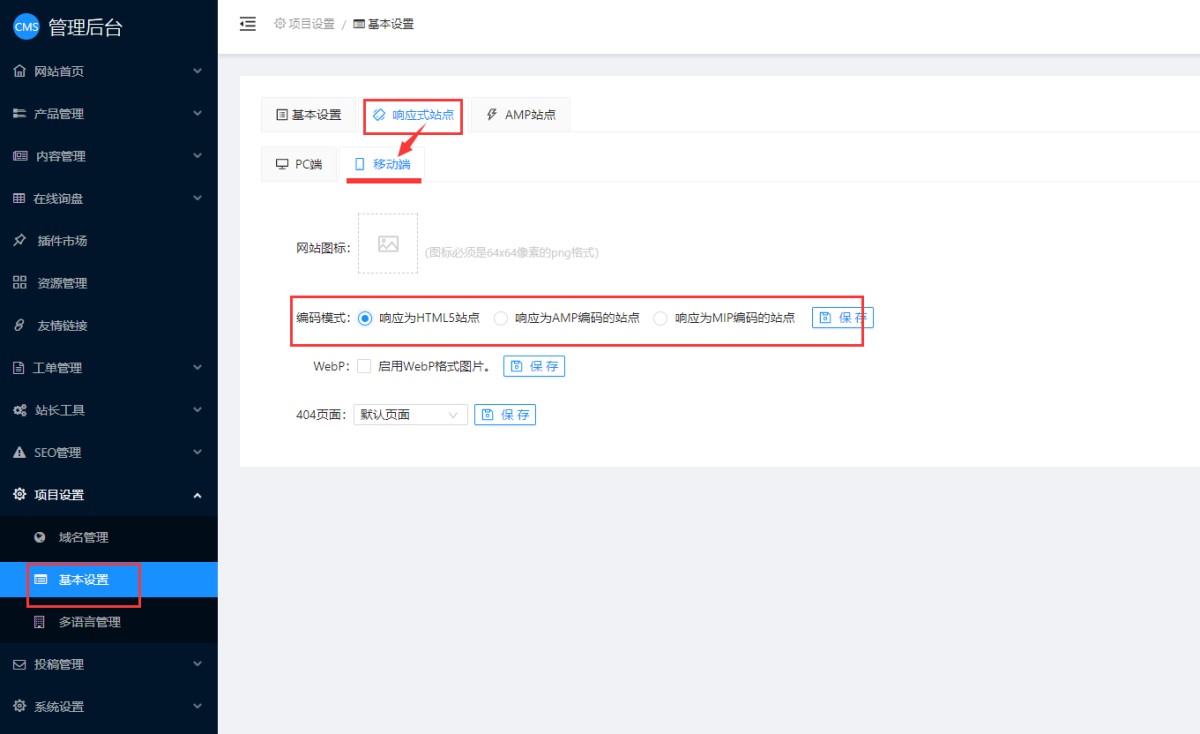 在管理后台-项目设置-基本设置-响应式站点-移动端里,编码模板选“响应为HTML5站点”即可。