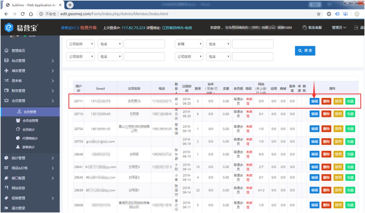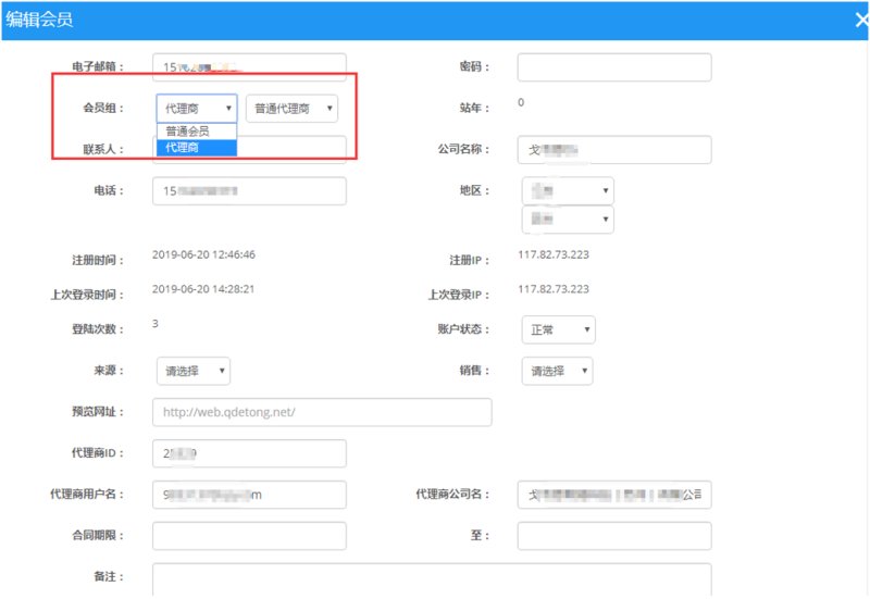 2,如何需要将账号调整成代理商等级,可登录超级管理后台(http://edit.***.***/Form/index.php/Admin/Login.html),在会员管理里,找到你要调整的账号,点击编辑。