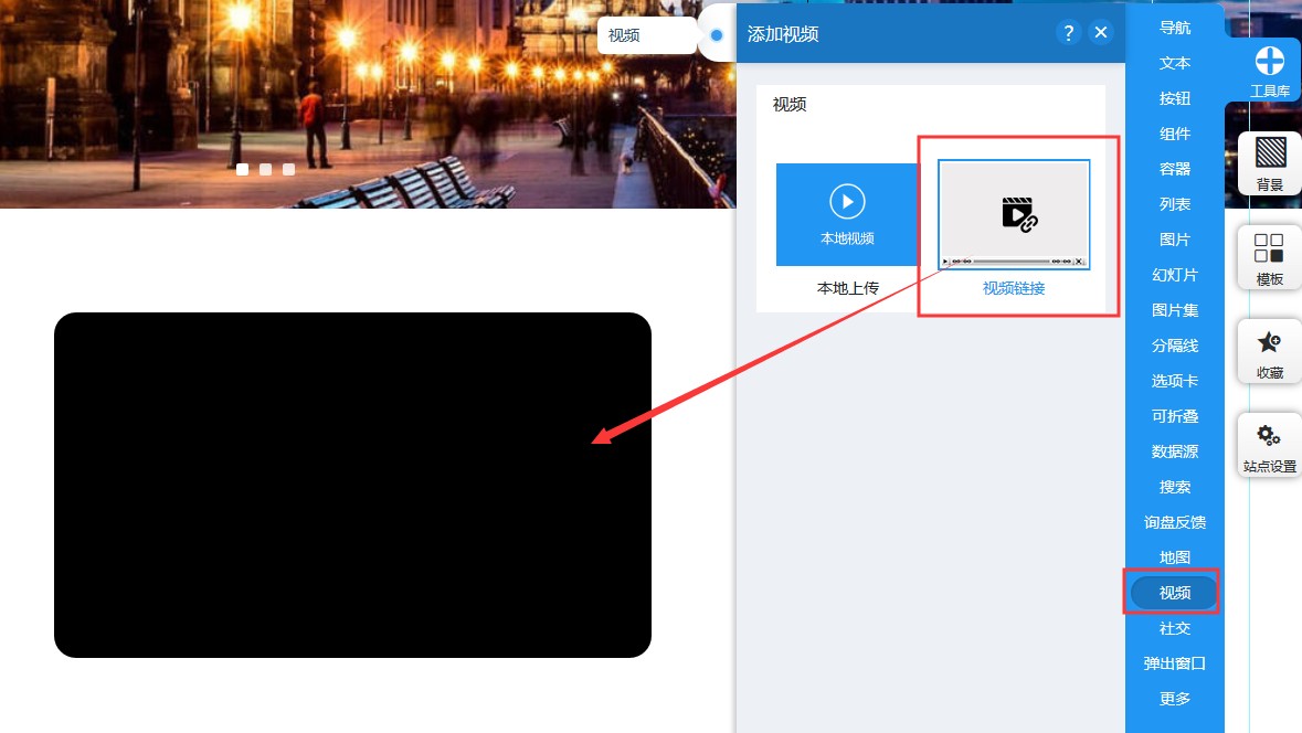 1,在工具里选择视频控件,第二个样式-视频连接,添加到页面上。
