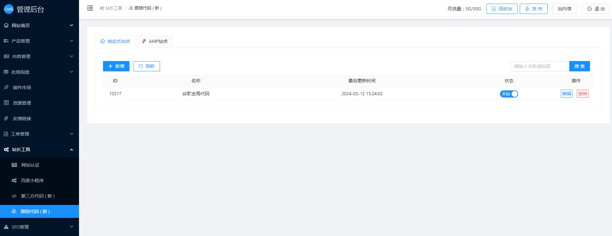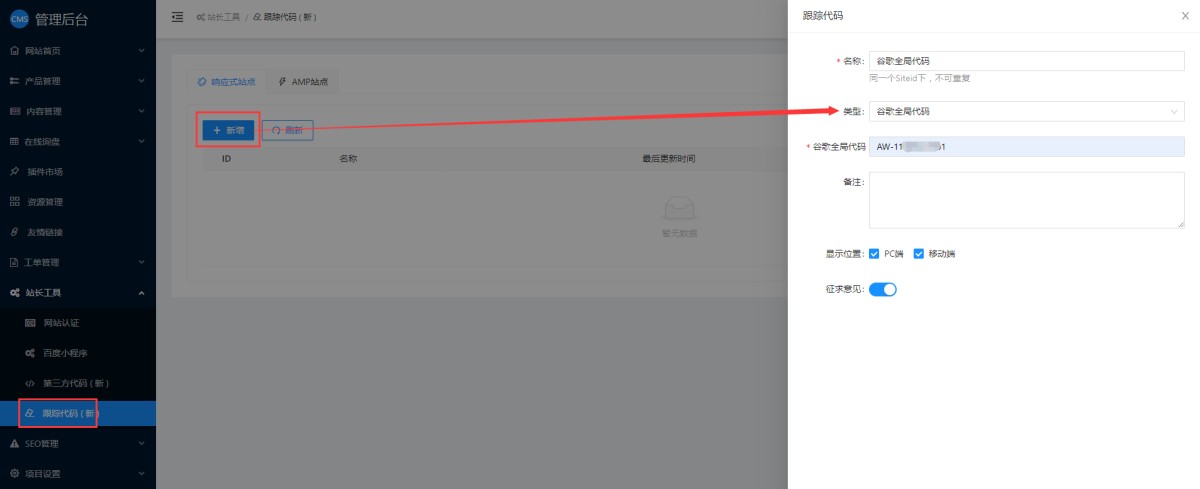 2,在网站CMS管理后台,站长工具-跟踪代码里,点击“新增”。