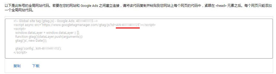 1,全局网站代码又称全局代码,代码由谷歌客服提供,如下图样式,其中画横线的部分为ID。