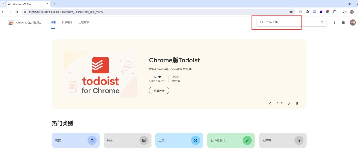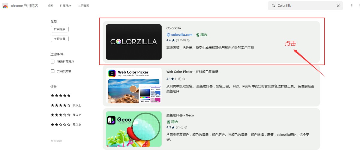 1,在谷歌浏览器里打开chrome 应用商店:https://chromewebstore.google.com/?utm_source=ext_app_menu,在搜索框里搜“ColorZilla”