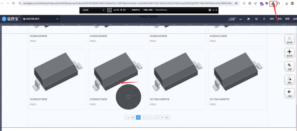 6,设置固定后,在浏览器右上角会显示取色吸管。使用时点击吸管,再用鼠标左键点击页面上需要取色的位置,就会自动取色并自动复制色值。