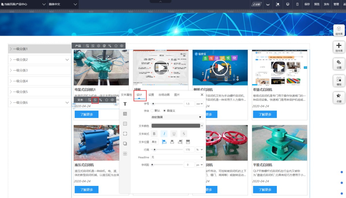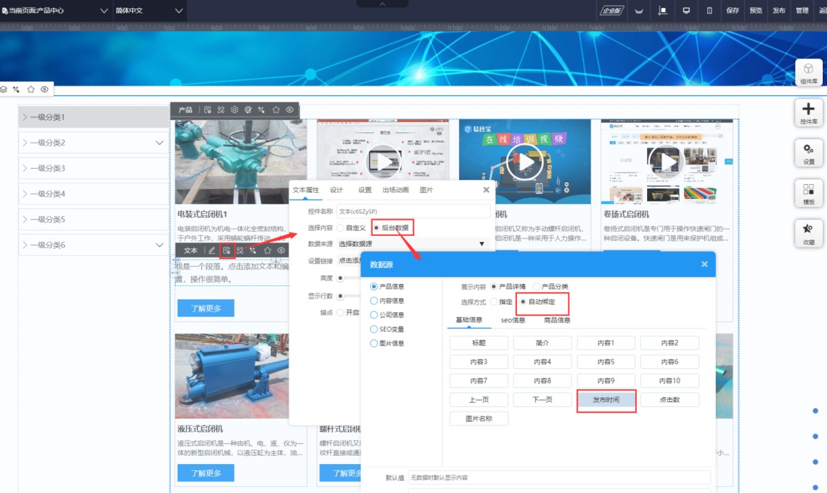 2,在文本属性里,选择后台数据。如果是产品列表,数据源选产品信息-产品详情-自动绑定-发布时间;如果是新闻列表,数据源选内容信息-内容详情-自动绑定-发布时间。设置完成后,保存刷新,其他产品会同步显示。