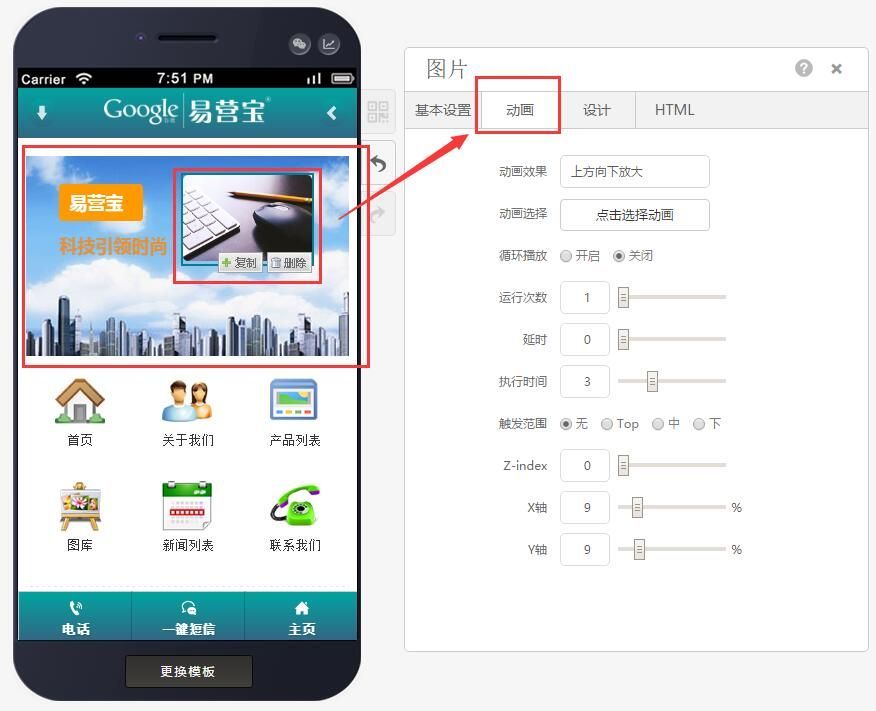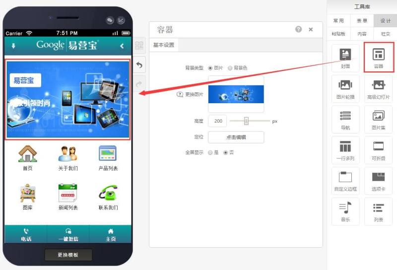 第三步:容器内可拖入标题、按钮、文本、图片、搜索控件,且可以给这些控件添加动画效果,如下图: