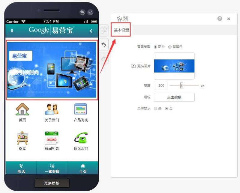 第二步:根据自己的需求编辑基本设置,选择背景图或者背景色、高度、定位以及是否全屏显示,如下图: