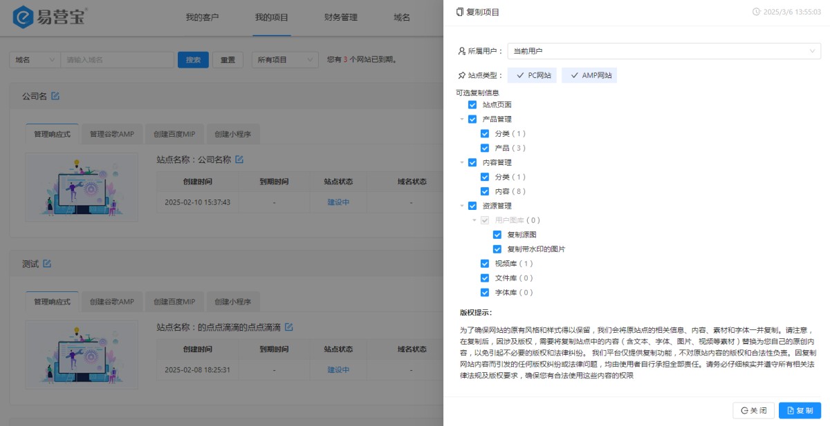 可选复制信息:用户可以选择要复制的内容,包含页面,产品,内容,资源管理。默认全选。其中用户图库可以选择复制原图或复制带水印的图片。