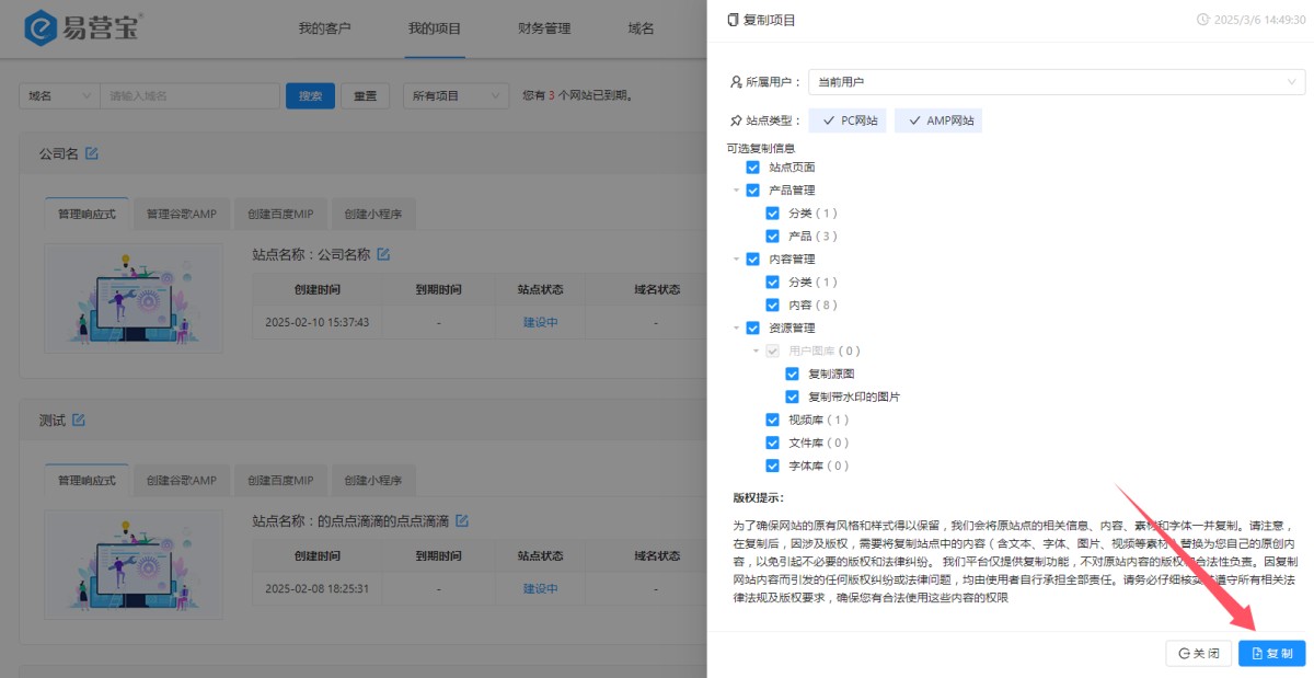 站点类型:展示当前项目下所有的站点,用户可以选择复制的网站,默认是全选的。