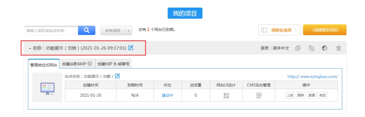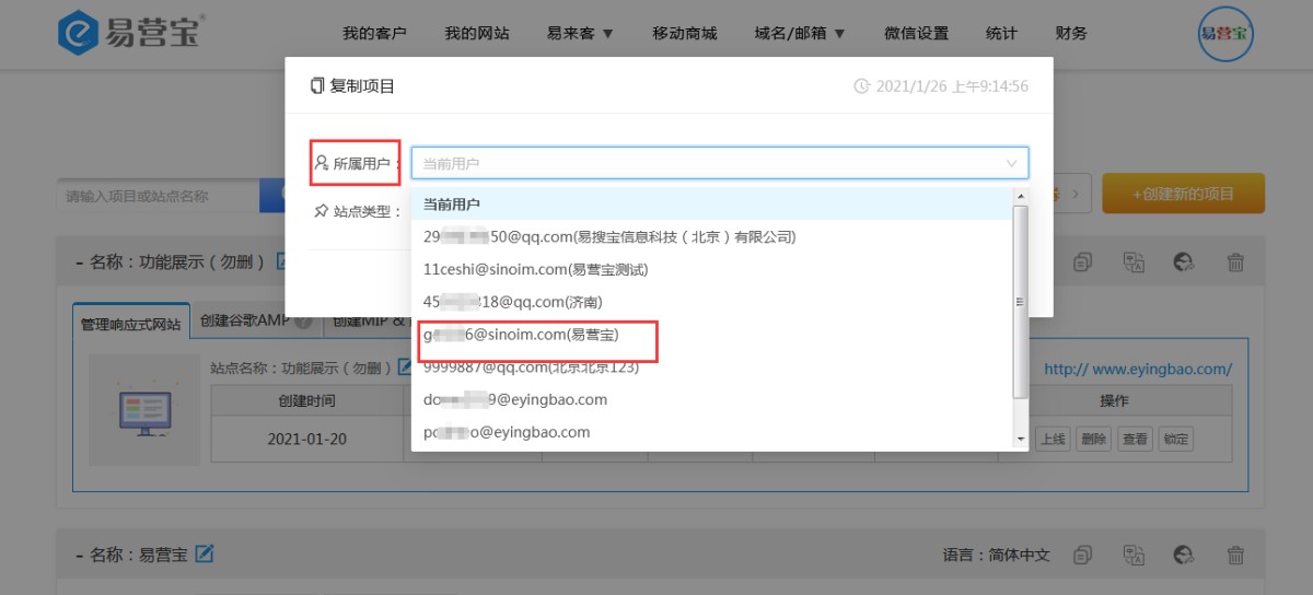 4,登录B账号,在项目列表里就会都显示复制的网站了。复制出的网站可自行修改,不影响原网站。