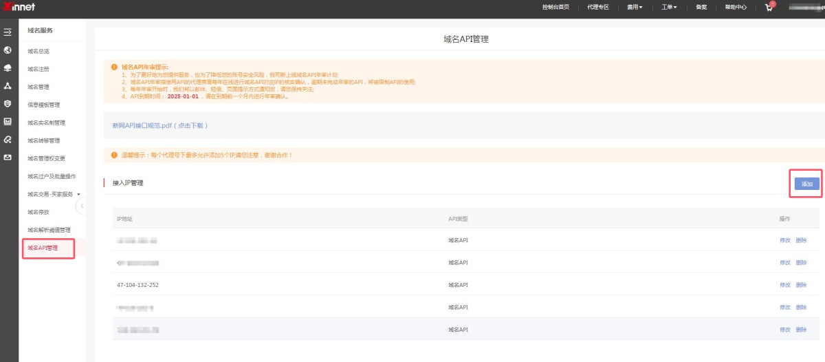 2,获取API密码:登录新网账户,在“域名API管理”里点击“添加”。