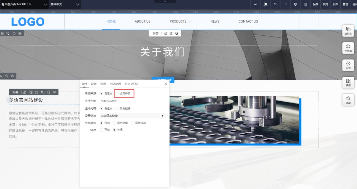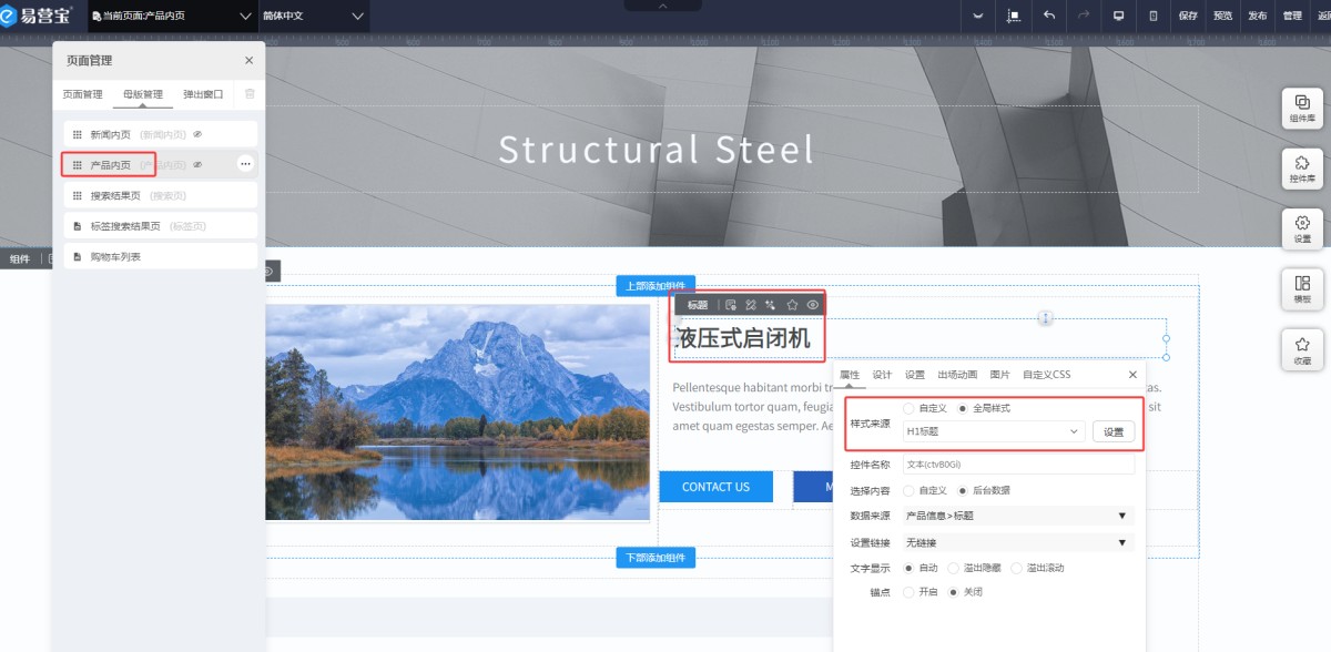 5,产品或新闻详情页的标题,如果需要设置H标签,可以在产品/新闻内页里,标题数据源控件属性里,选择全局样式,设置相应的H标签即可。