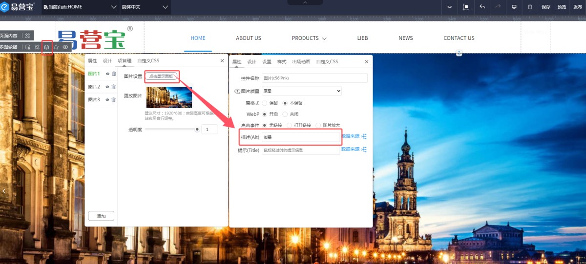 2,多图轮播:在项管理里,点击图片设置,在图片设置里可以设置图片Alt。