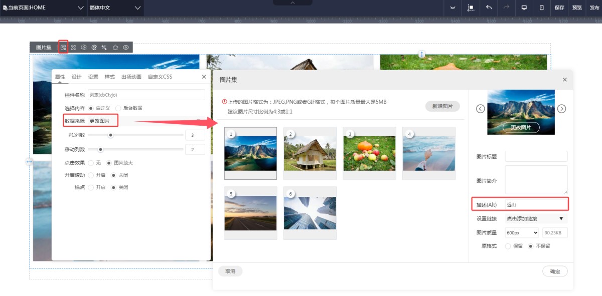 3,图片集:自定义图片的,在图片集属性里,选择图片的界面,可以为每个图片设置Alt。