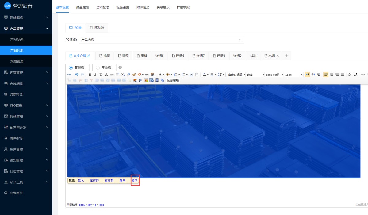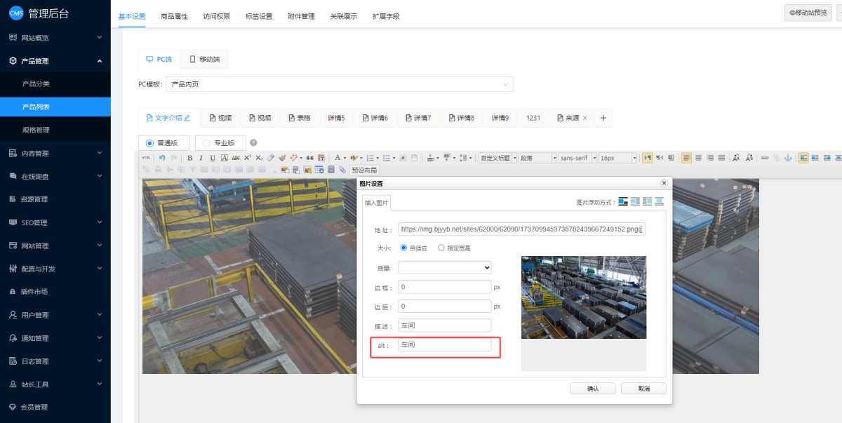 6,产品/新闻详情里的图片:系统会默认使用图片名称生成图片Alt,但是再修改的话,需要点击图片,在图片下方会显示图片设置,点击修改