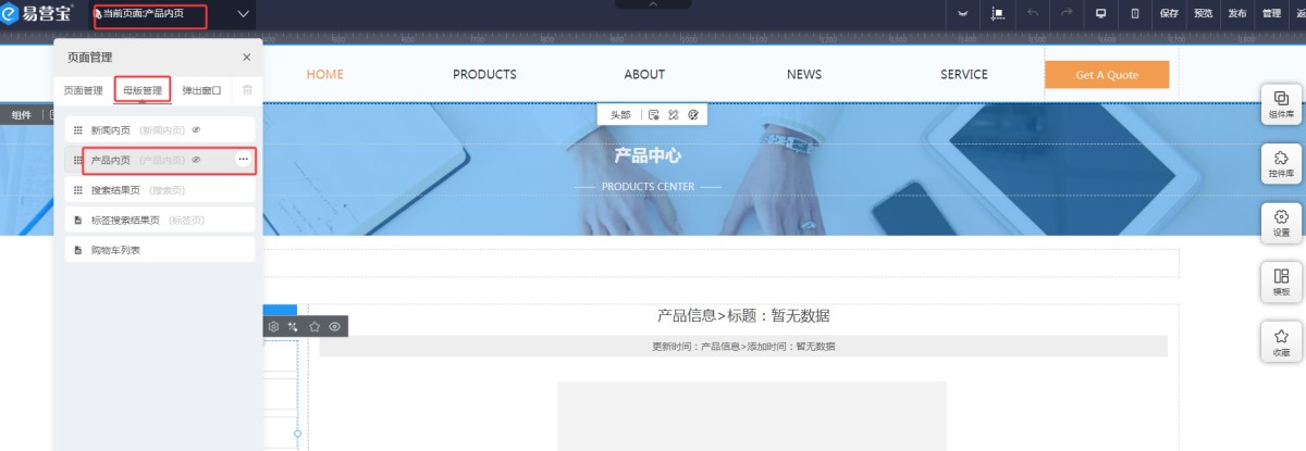 1,在UI编辑页面,页面管理里,点击模板管理-产品内页。