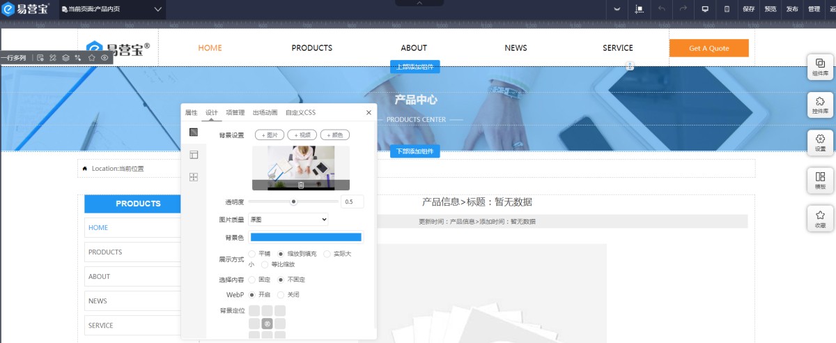2,产品内页就是产品详情页样式模板,所以在产品内页里修改banner即可。如果是组件,则banner图片是在组件的背景图处修改。如果是轮播图,在轮播图属性里修改即可。修改后,所有产品详情页的banner都会变更。
