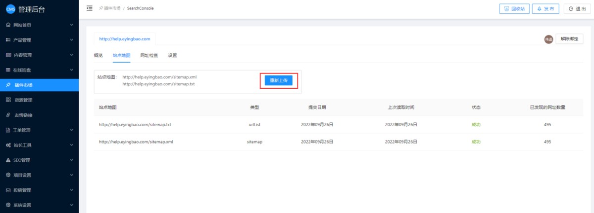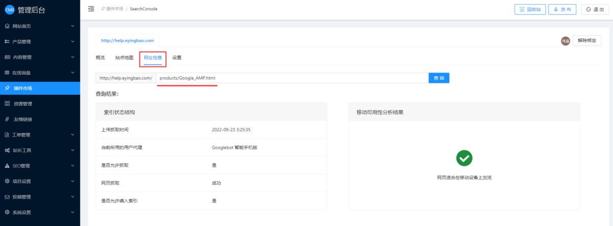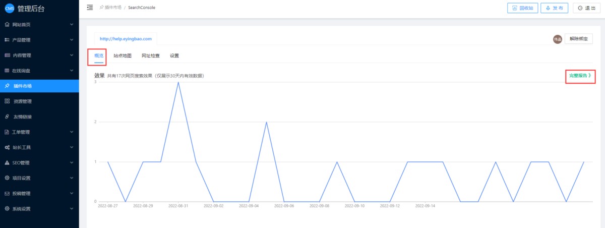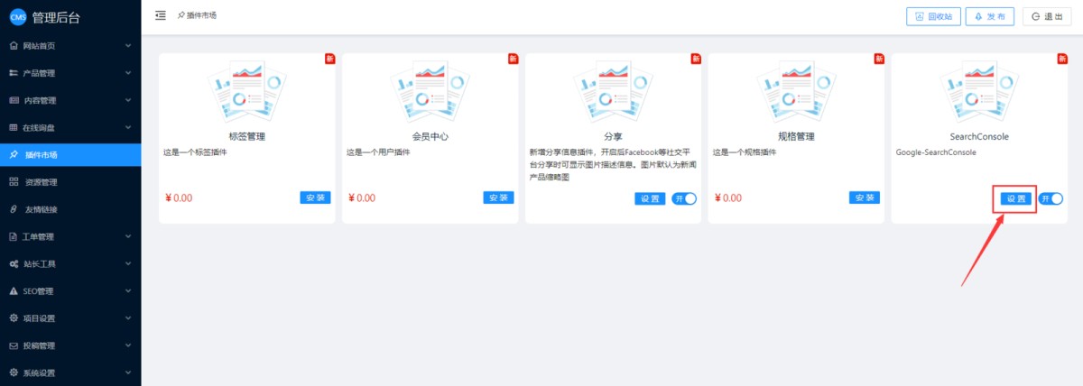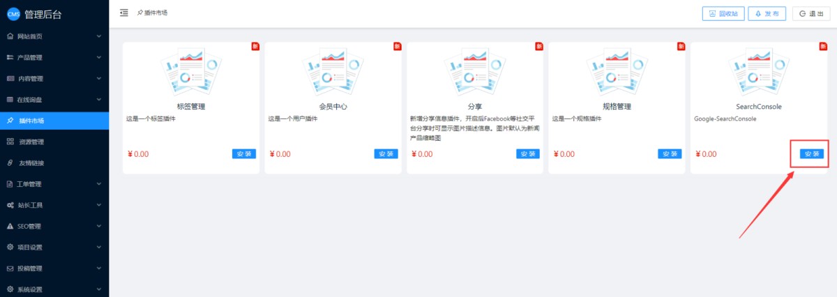 1,在CMS管理后台-插件市场里,点击安装Search Console的插件。