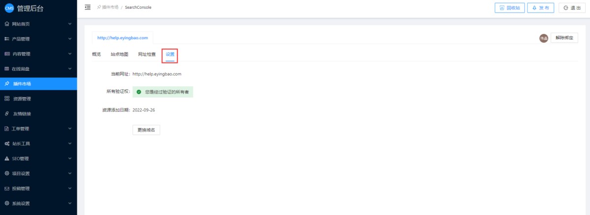 11,在设置里,可以更换域名。(如果网站域名换了,需要在这里点下更换)。