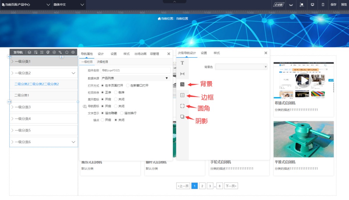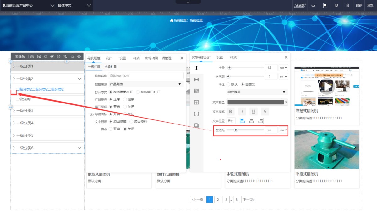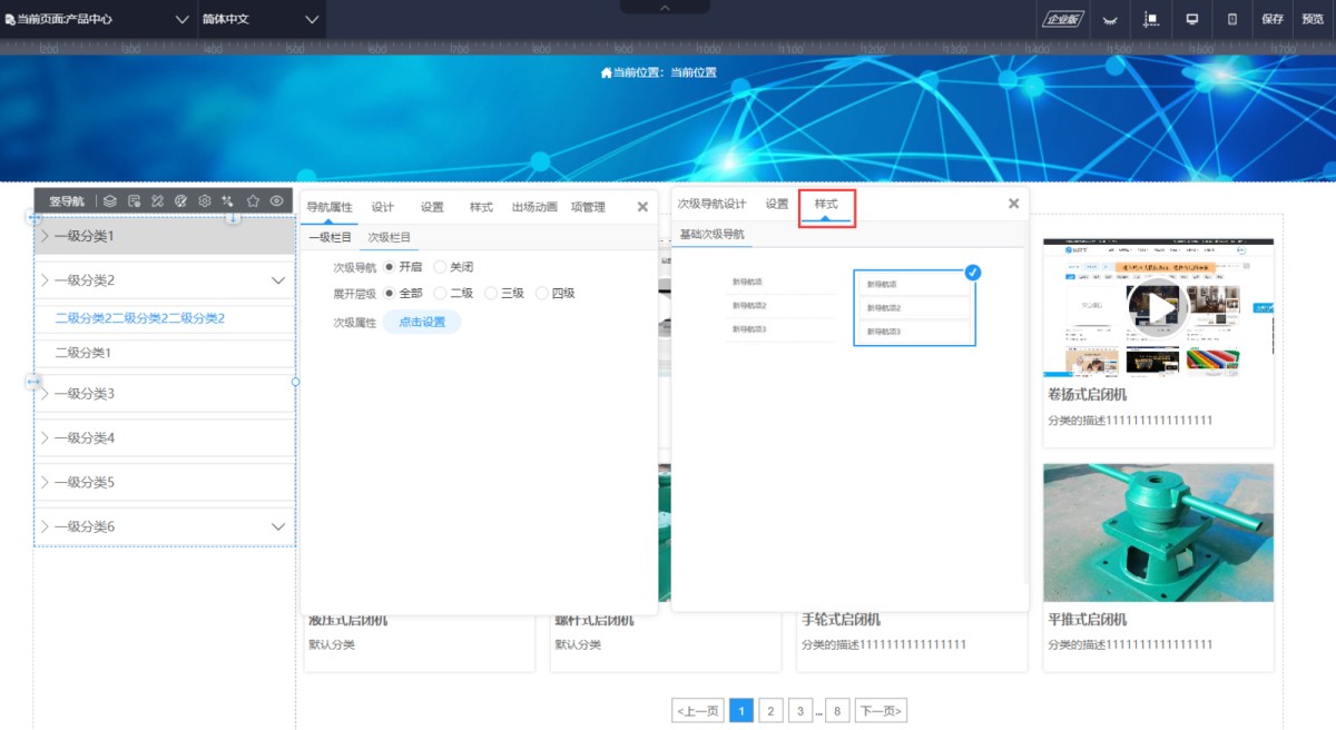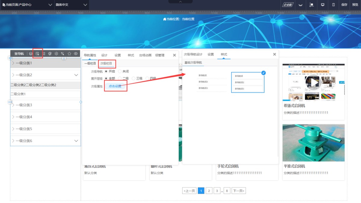 1,在导航属性-次级栏目里,点击次级属性设置,打开次级导航的设计面板。