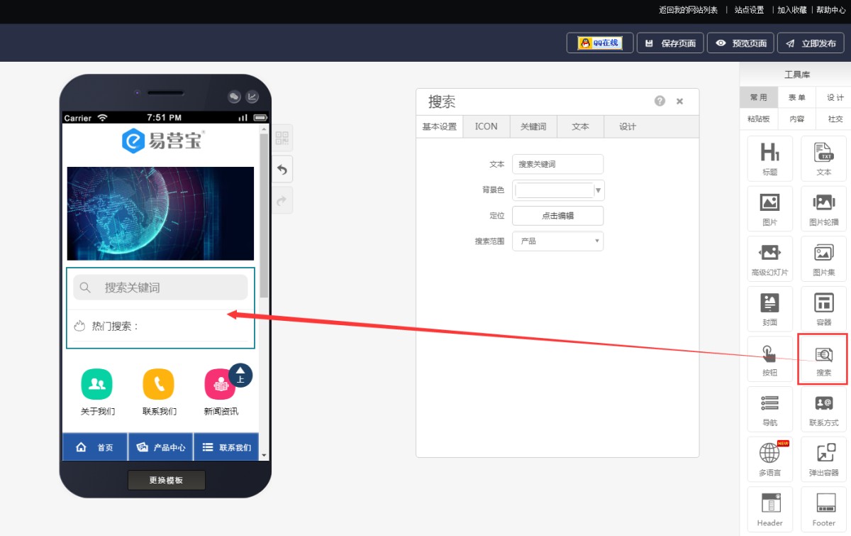 1,从工具库里选择搜索控件,拖拽添加到页面上。