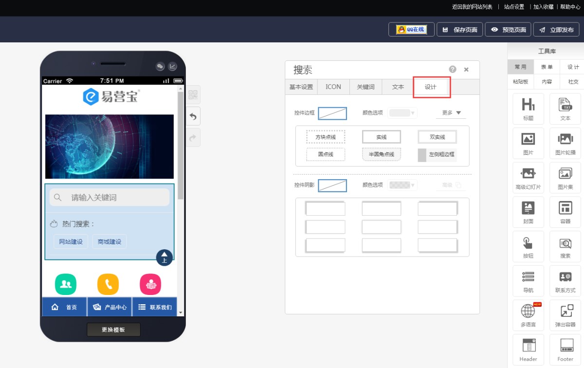 6,在“设计”里,可以设置搜索控件的边框、圆角、阴影等样式。