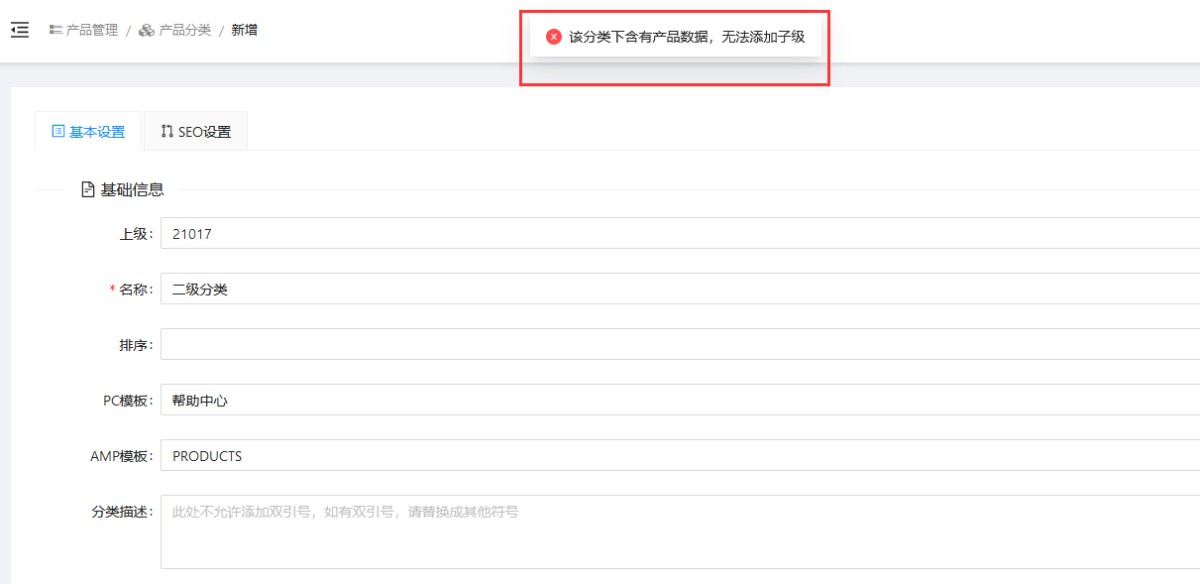 1,添加次级分类时,有时会遇到添加不成功的情况,提示是“该分类下含有产品数据源,无法添加子级”。这是因为一个分类下不能既包含直属产品又包含次级分类。