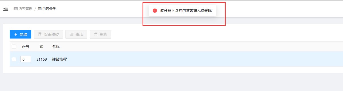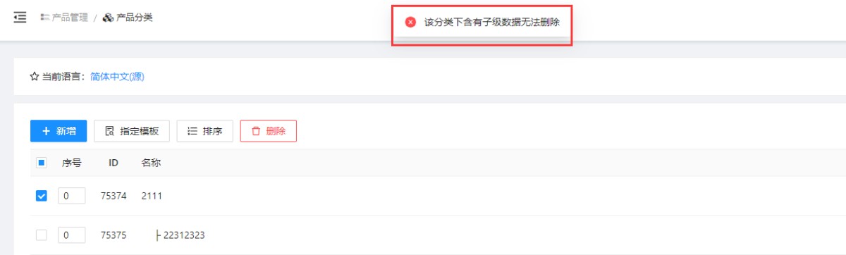 2,删除分类时,有时会提示:该分类下含有内容/产品数据源无法删除或该分类下含有子级数据无法删除。这是因为如果这个分类下还有产品或次级分类,就无法删除,比如先删除或转移产品/次级分类。