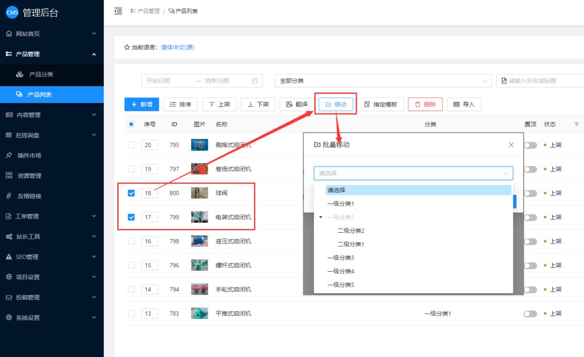 转移产品的操作如下:在产品列表选择要转移的产品后,点击移动按钮,选择要转到的分类即可。